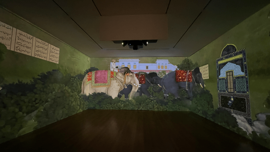To connect past and present, I created an immersive digital installation where Islamic patterns and figurative elements move across three connected walls as one continuous screen. Accompanied by music, the animation allows visitors to step inside geometry, to feel surrounded by rhythm and motion. Islamic art is often seen behind glass cases. Here, it becomes alive, immersive, and experiential.