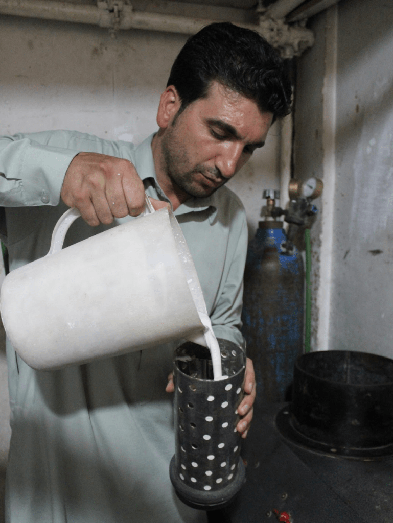 Raw material is procured ether by purchasing pure gold or used from local market and families. While working with used gold, essentially the master determines the karat of gold by karatmeter. Titration is a process which shows the amount of mixture of pure gold with another substance metals. The pure gold is 24 karat. Meaning no metal is combined. Usually, gold in Herat market could be found in 22, 21, 18, 16, 14, 9 karats. There is a simple calculation method in titration. Whatever number come from less than 24 karat the remaining is supplementary substance metal that has mixed with gold. For instance, 18 karat gold, is combined from 18 karat pure gold and 6 karat another metals.