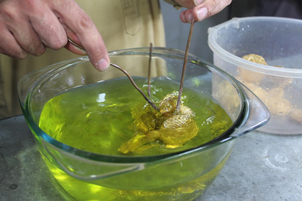 In fact to purify the gold, the goldsmith master melts the gold and added to an aqua regia device to wipe out its gross and extra material. The purified gold is then subjected to a grade by titration test. However, gold measuring unit is gram in Herat and the size, design and weight is determined by the customer’s request . Also, it is feasible to make an ornament with different dimensions and weights, though.
