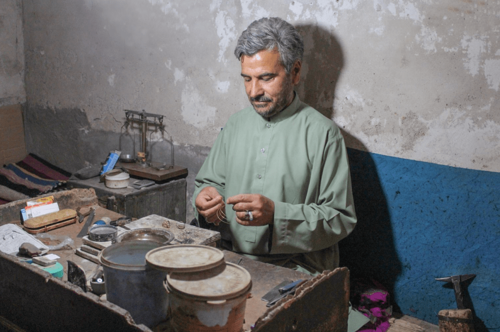 Goldsmith in Herat has been prodomnatly family profession and business, the communities who practiced the craft were from the mid class of Herat society. These families were lived mostly around the zargaran alley or goldsmith street, Charso and generally in the old city of Herat. 50 years ago, goldsmith workshops and jewelry shops were located in zargaran alley where practiced by more than 15 experienced masters and about 2 to 3 apprentices in 10 workshops. The number gradually decreased during the Communist and Mujahideen era due to instability and civil war. The number of master’s declined to minimum during the Taliban regimes due to lack of market and poor economy of families in Herat and overall Afghanistan.