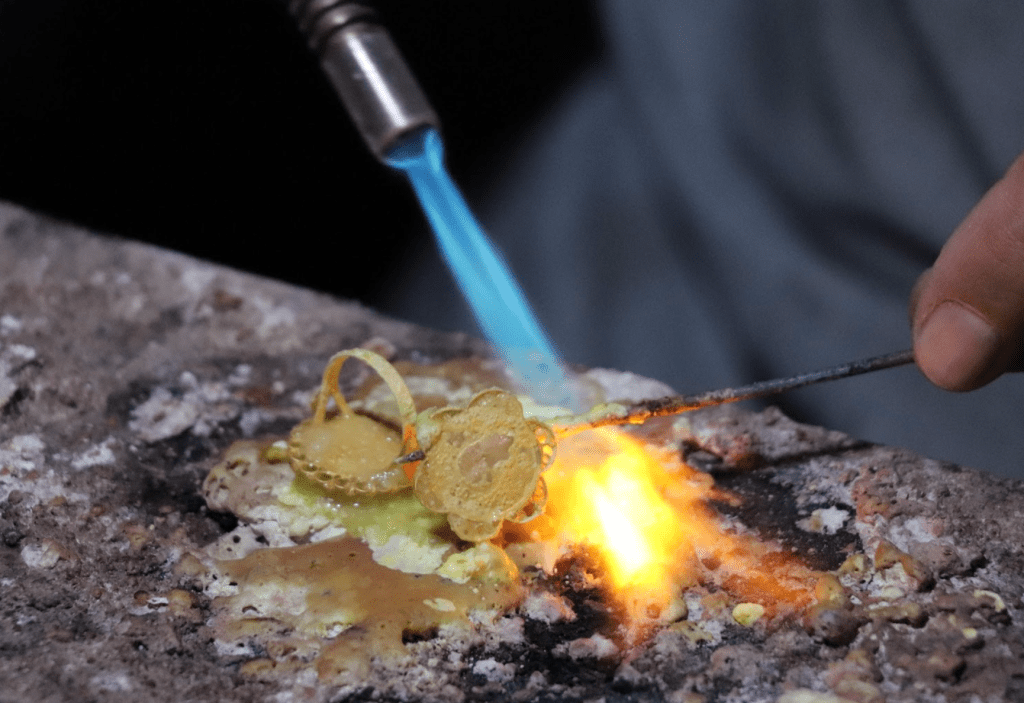 When the gold removed from the gypsum cast, the master will put all the pieces in an electronic device called magnet device. The magnet device will vibrate for 20 minutes and remove ashes, small particles of gypsum from the gold. The next process is to start joining the jewelry fragments together. Soldering is one of the most important steps to attach jewelry-related parts together to make the main body and structure of a jewelry.